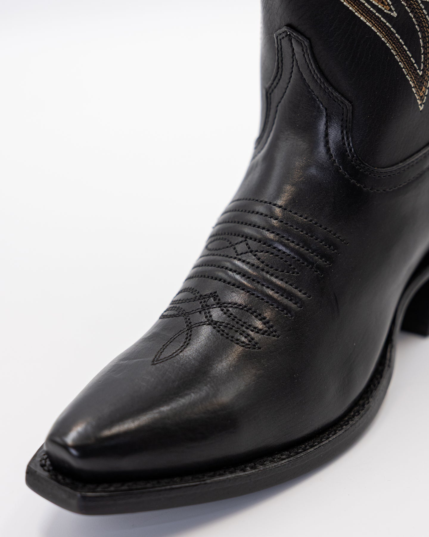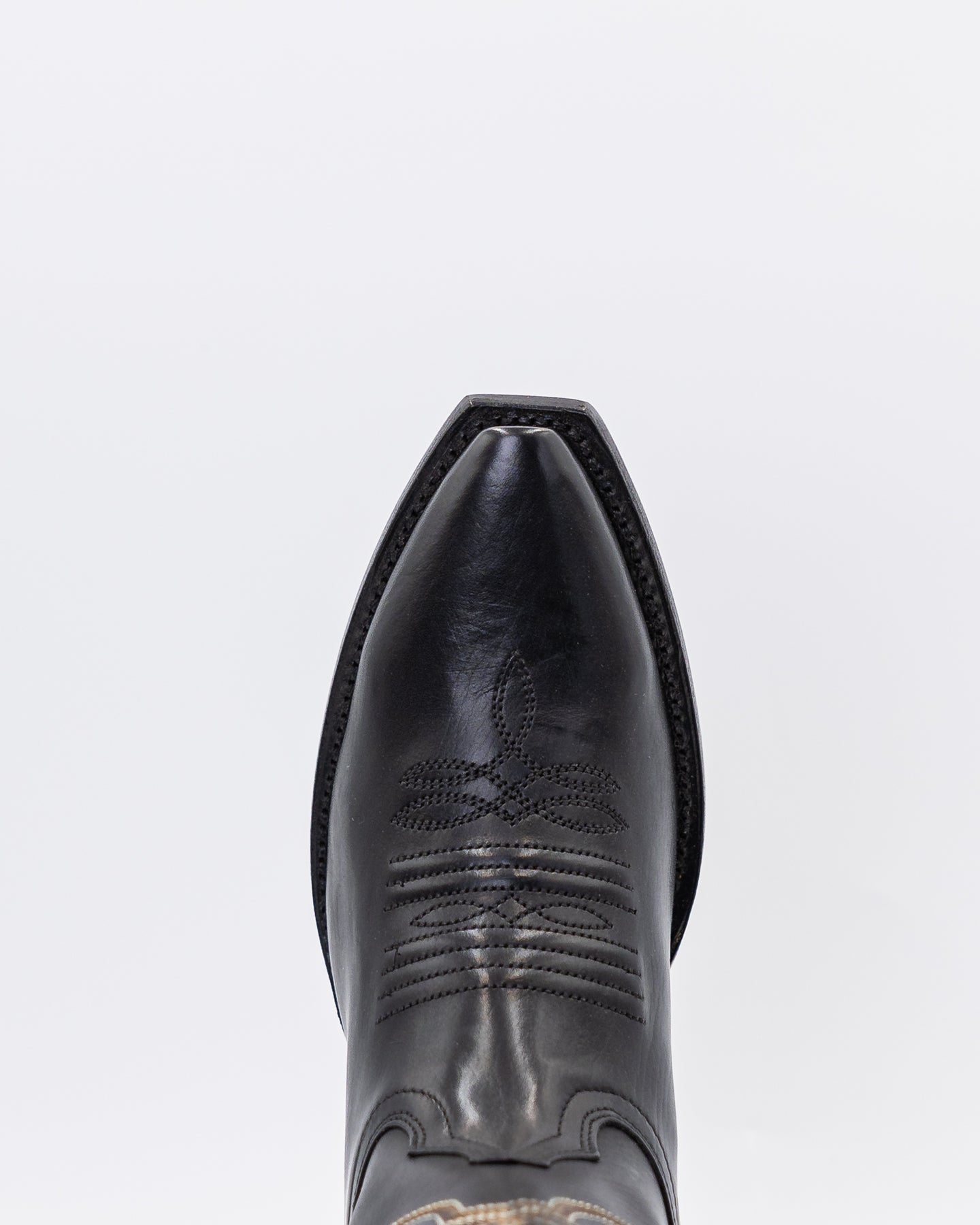 Meet the Alexia Onyx, a sleek and timeless addition to any Western wardrobe. Handcrafted from premium black leather, this boot embodies sophistication with its smooth finish and clean, minimalist look. The shaft features tonal black stitching, creating subtle texture and depth while maintaining a refined, monochromatic style. Confident and versatile, the Alexia Black Onyx is the definition of understated Western elegance.