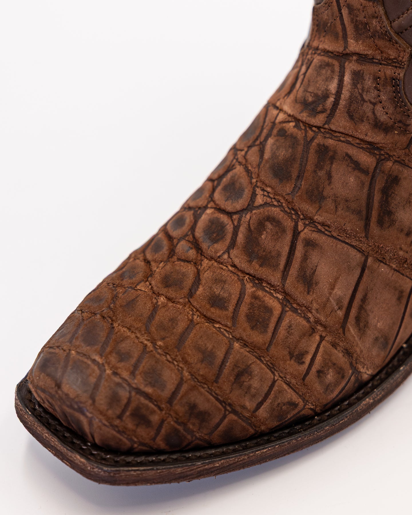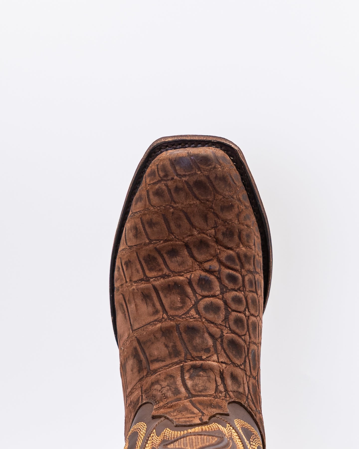 Meet the Copper, a bold expression of Western tradition and exotic style. Handcrafted from genuine caiman leather in a striking green agave finish, this boot showcases the natural texture and depth of caiman, paired with a modern square toe for a sharp silhouette. The look is elevated with a honey-colored leather shaft, detailed with elegant Western stitching that adds warmth and balance to the bold green vamp. Finished with a durable leather sole and comfortable fit, the Copper is built for those who want to stand out while staying true to authentic Texas Country craftsman