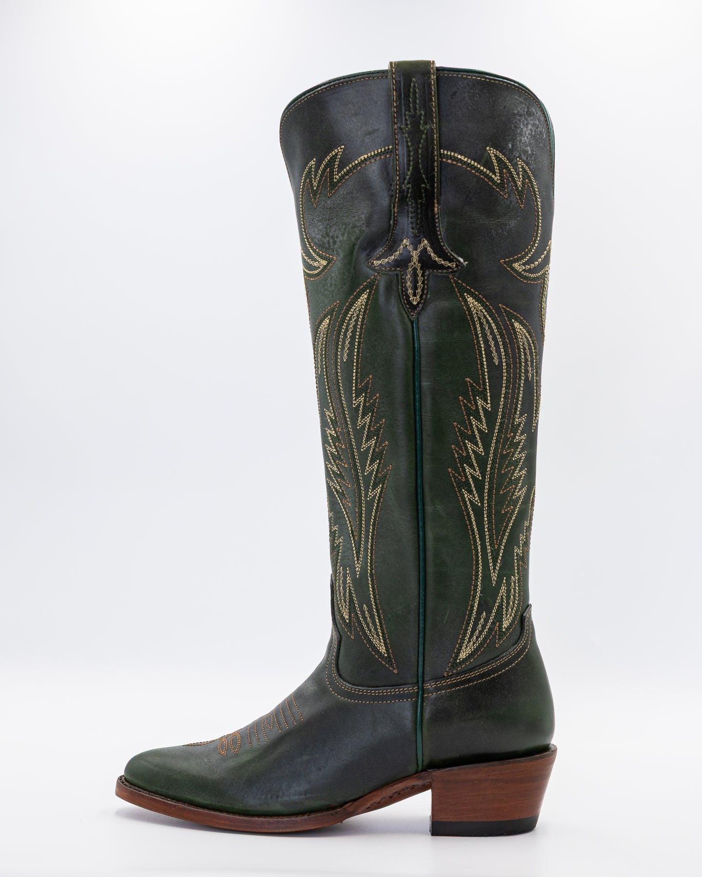 Meet the Moet Emerald, a striking statement piece that blends bold color with timeless Western elegance. Handcrafted from premium emerald green leather, this boot radiates confidence and sophistication with every step. The tall 17-inch shaft is adorned with beige stitching, adding a touch of refined contrast that highlights its graceful Western design. Built with a 2-inch heel for the perfect lift and a durable leather sole for lasting wear, the Moet Emerald combines luxury, comfort, and craftsmanship in one unforgettable silhouette. Finished with a soft leather interior.
