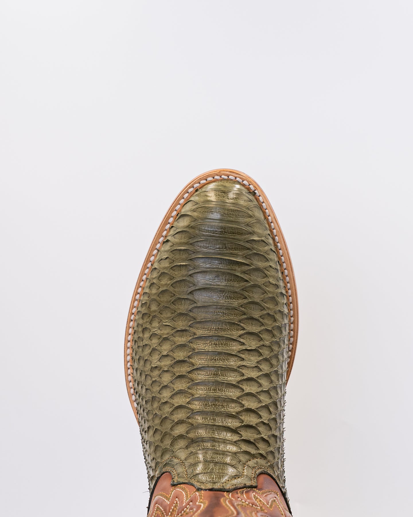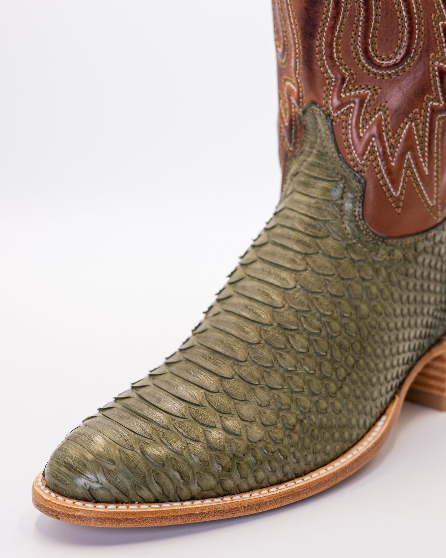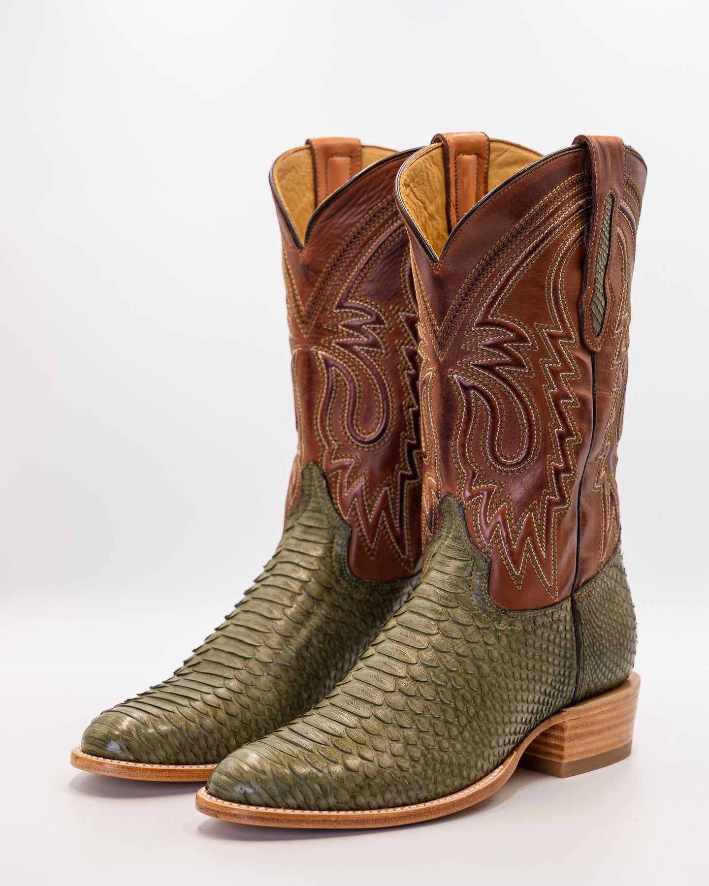 Introducing the Rowdy Agave, a true masterpiece of Western craftsmanship that captures the bold spirit of the Lone Star State. Expertly handcrafted from 100% genuine exotic python leather, each pair highlights nature’s unique artistry with mesmerizing scale patterns across the vamp and foot. The upper shaft features a sleek, woven finish that beautifully contrasts the natural texture of the python skin, creating a striking, head turning design. Finished in a rich agave green and styled with a classic round toe, these boots are made in León, Guanajuato a city renowned for its leatherwork tradition and boot making excellence.