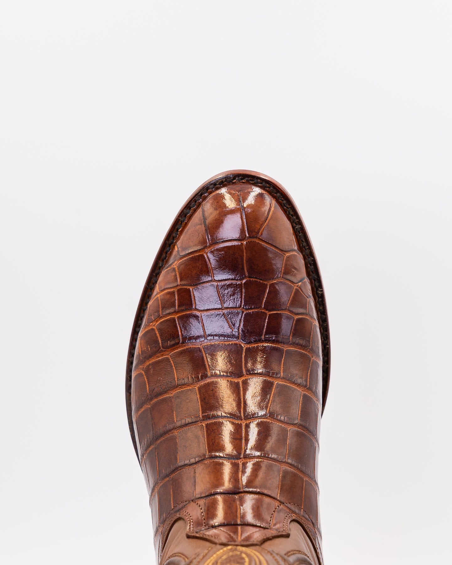 Meet the Ranger, a true symbol of craftsmanship and Western tradition. Made from genuine American alligator belly in a rich brandy finish, this boot showcases the natural elegance and strength of exotic leather. The vamp’s unique alligator pattern makes every pair one of a kind, while the leather shaft is detailed with classic Western stitching for an authentic touch. Built with a leather sole and smooth leather shaft, the Ranger boot combines durability with timeless style. Perfect for collectors, professionals, and Western enthusiasts, it offers a refined balance of luxury and tradition.