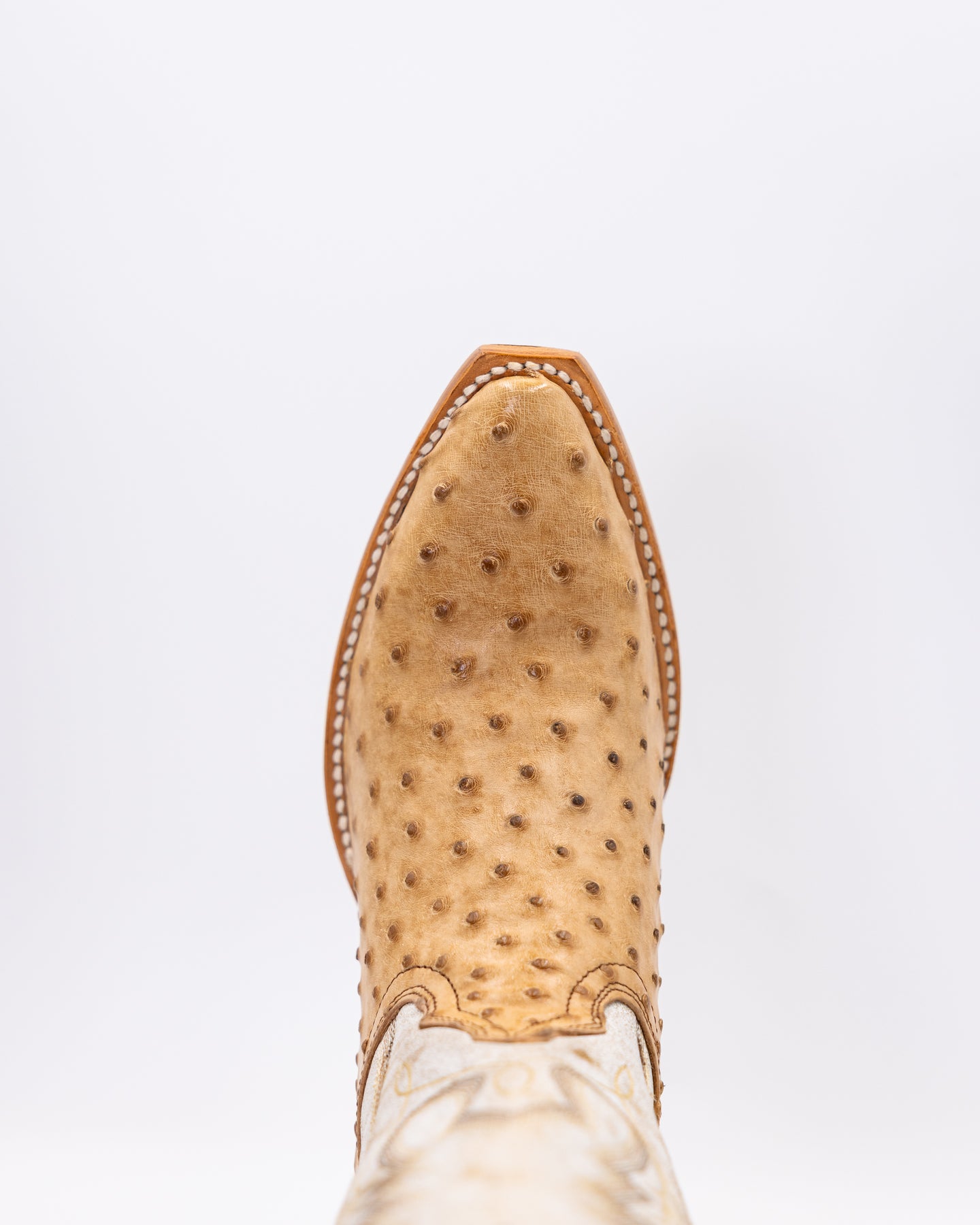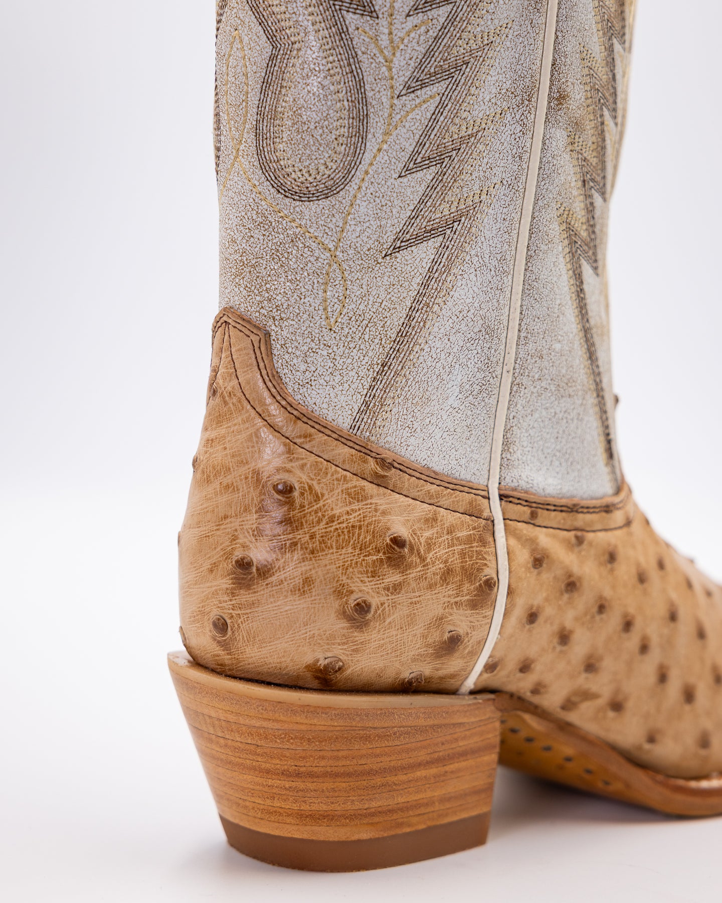 Step into elegance with these handcrafted women’s boots, featuring a full quill ostrich leather foot in a warm tan tone. The shaft stands tall in a rich sand color with intricate white stitching and pull straps for easy wear. Designed with a classic snip toe and a stacked leather heel, these boots blend timeless Western tradition with feminine sophistication. Perfect for both everyday wear and special occasions.