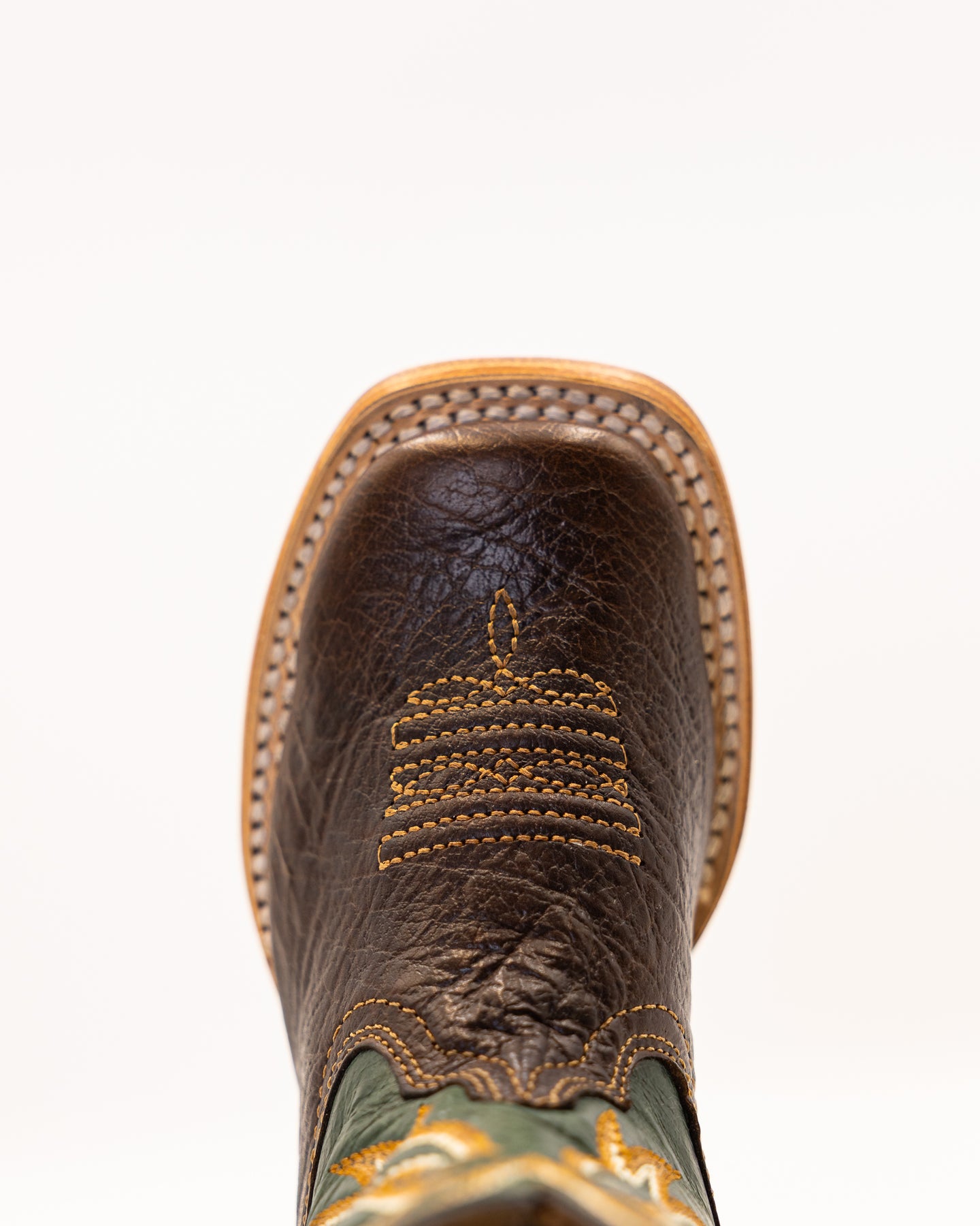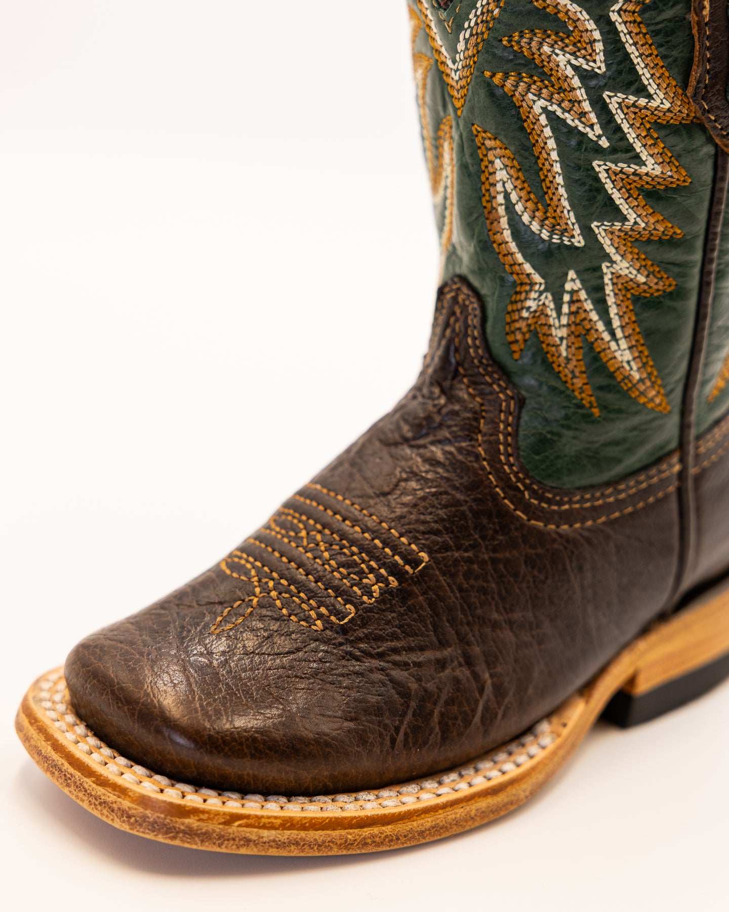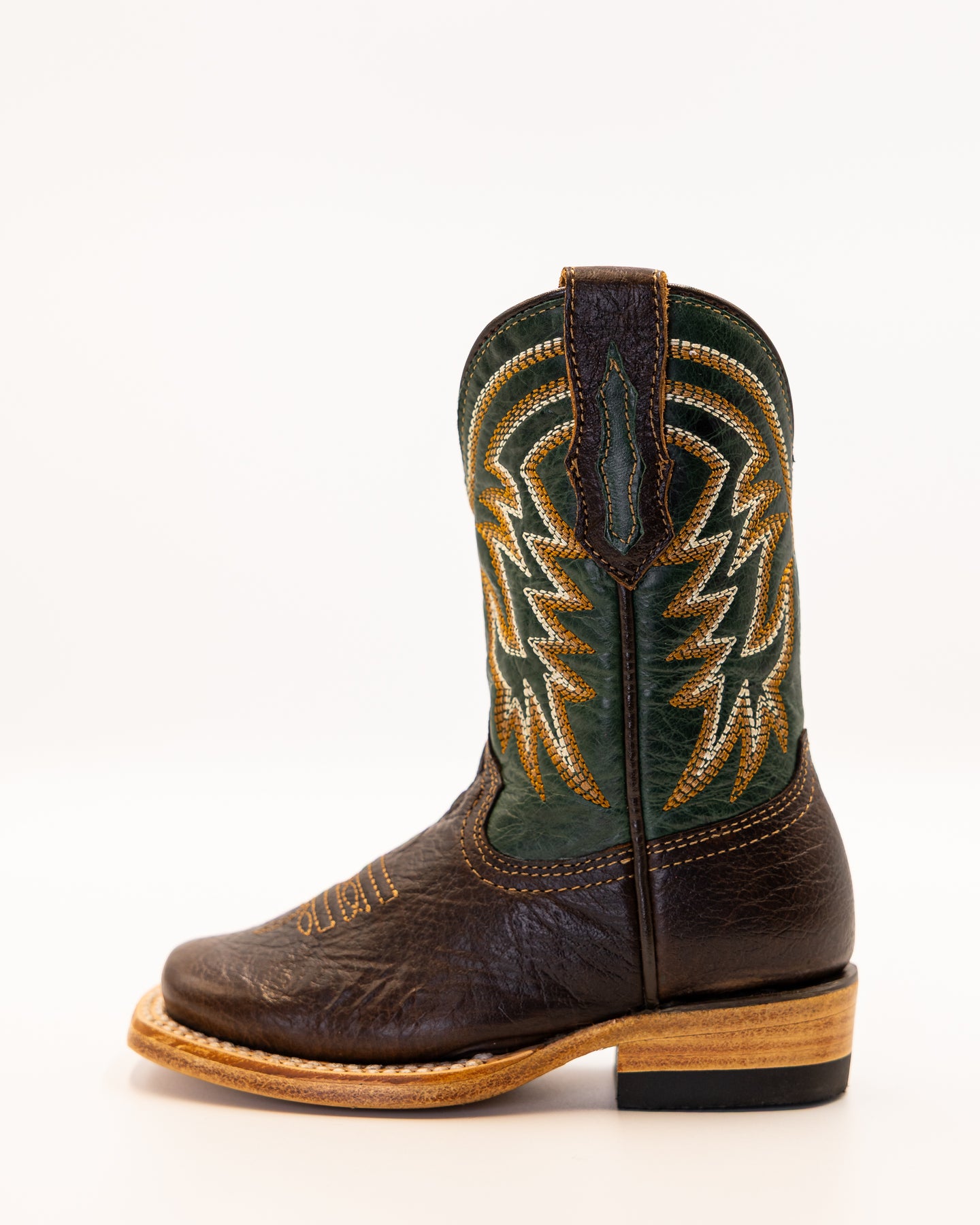 Meet the Austin Jr, built tough for the next generation of cowboys. Featuring durable full welt construction, this boot is made for long lasting wear and all day comfort. With a rich brown leather foot and a deep green shaft detailed in bold golden stitching, it delivers classic Western style with standout Texas flair.