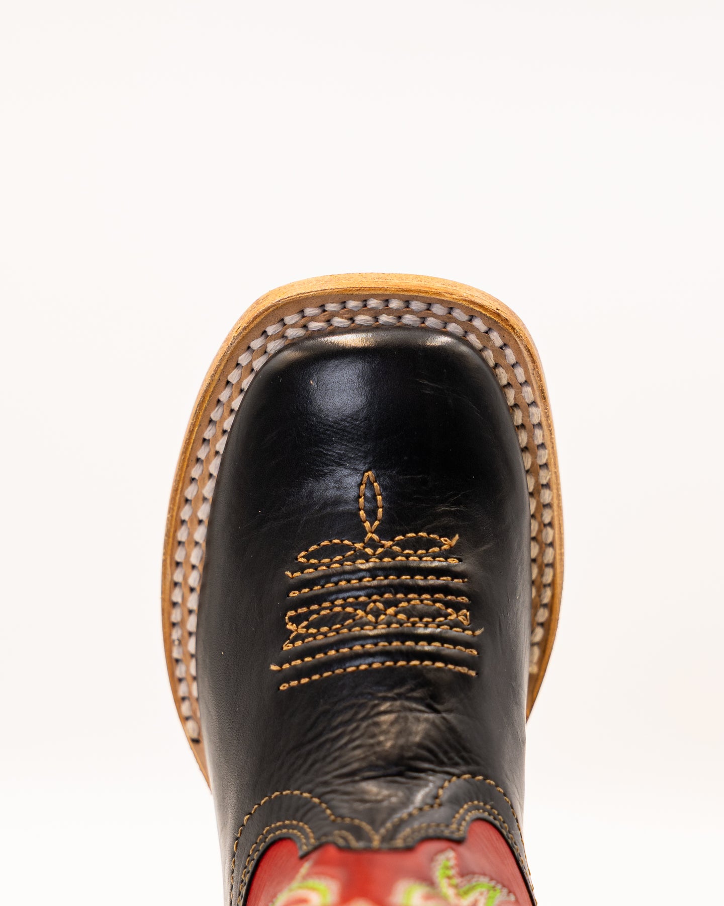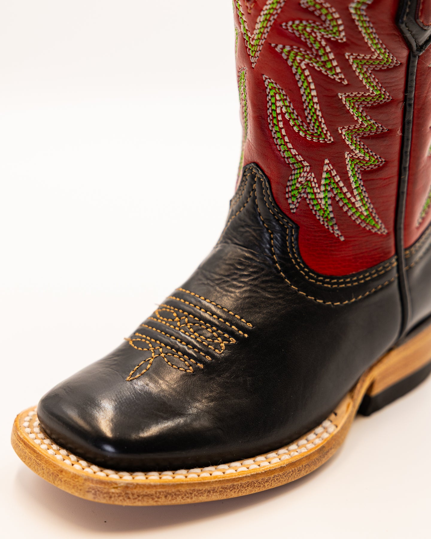 Meet the Austin Jr, built tough for the next generation of cowboys. Featuring durable full welt construction, this boot is made for long lasting wear and all day comfort. With a rich black leather foot and a deep red shaft detailed in bold golden stitching, it delivers classic Western style.