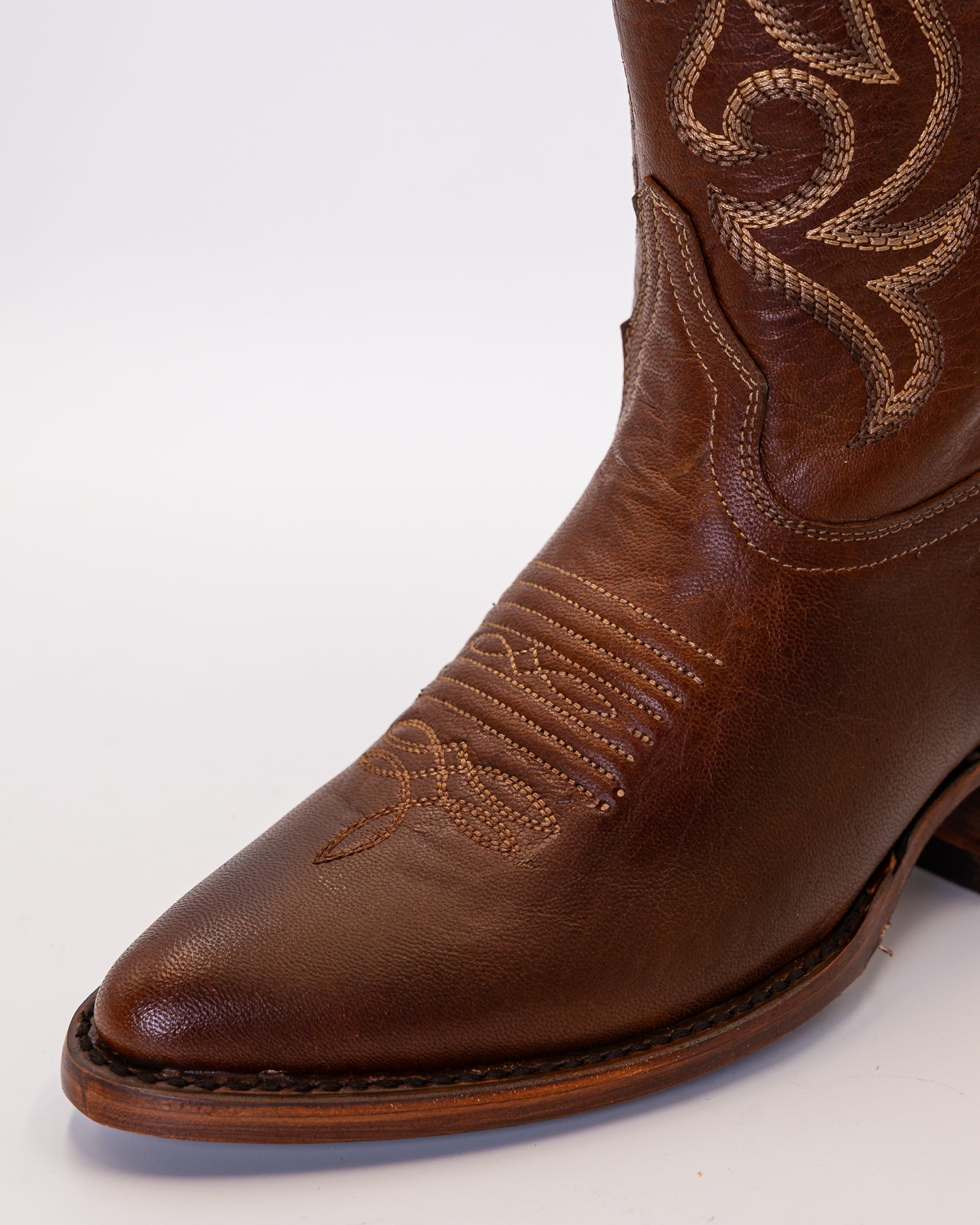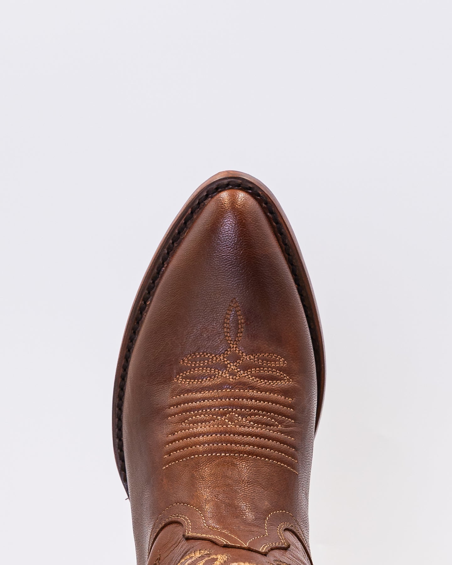 Meet the Scarlet Chestnut, a striking blend of contrast and craftsmanship. Featuring a brown calf leather vamp and a caramel leather shaft, this boot delivers a refined look that’s both bold and timeless. The beige stitching along the shaft enhances its classic Western design.