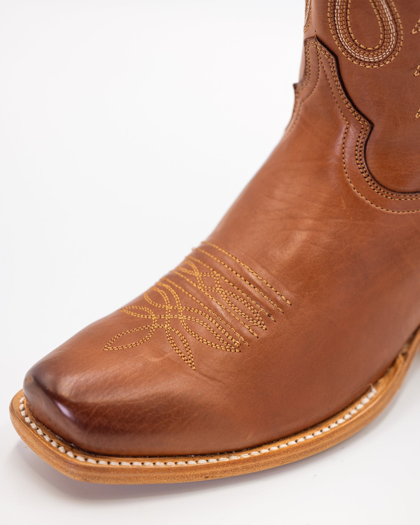 Timeless Western style meets handcrafted quality in this golden tan leather cutter toe boot. Made from premium smooth leather, the foot features subtle stitching accents that highlight its clean, elegant design. The tall shaft is richly detailed with bold Western embroidery in cream and tan, adding depth and character to the boot’s warm finish. Completed with a traditional cutter toe and stacked leather heel, this boot delivers comfort, durability, and an authentic cowboy look that never goes out of style.