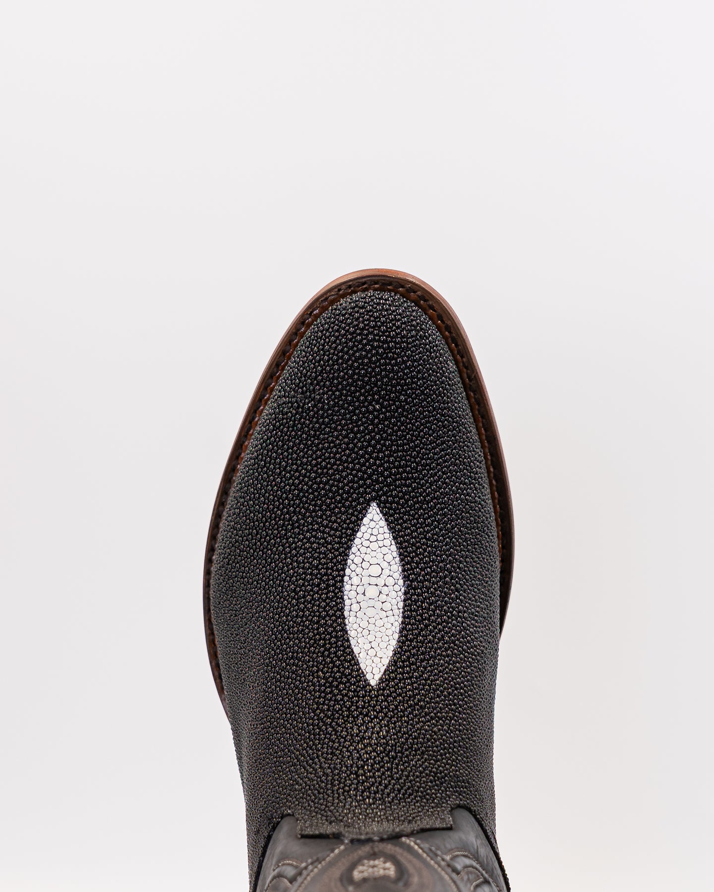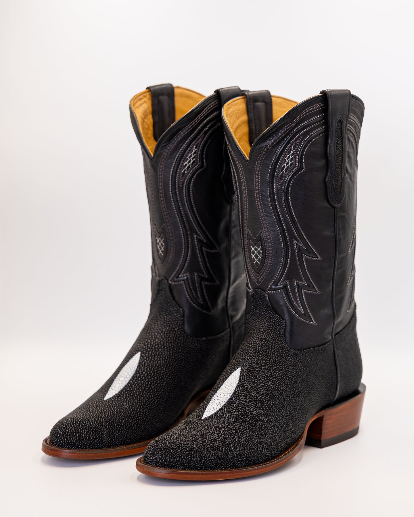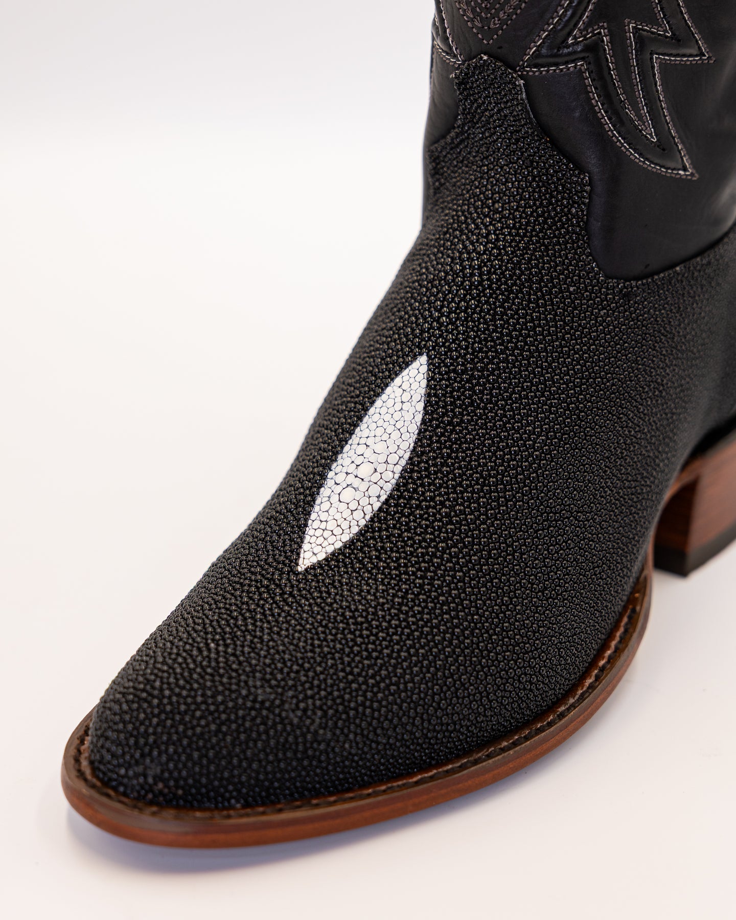 The Texas Country Stingray Onyx Boot brings together rare luxury and rugged Western tradition. Crafted from genuine stingray leather, the vamp features its signature pebbled texture and striking white diamond accent a natural hallmark of authenticity. The black leather shaft showcases detailed stitching in silver tones, creating a refined contrast that stands out with timeless style.